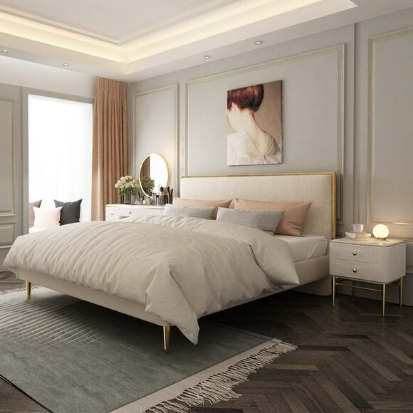 Zusätzlich sind zwei Nachttische im Set enthalten. Jeder Nachttisch hat ungefähre Maße von 50 cm x 45 cm x 55 cm (L x B x H). Das Set ist in der Farbe wie abgebildet erhältlich und besteht aus Holz mit Edelstahl-Elementen.**
