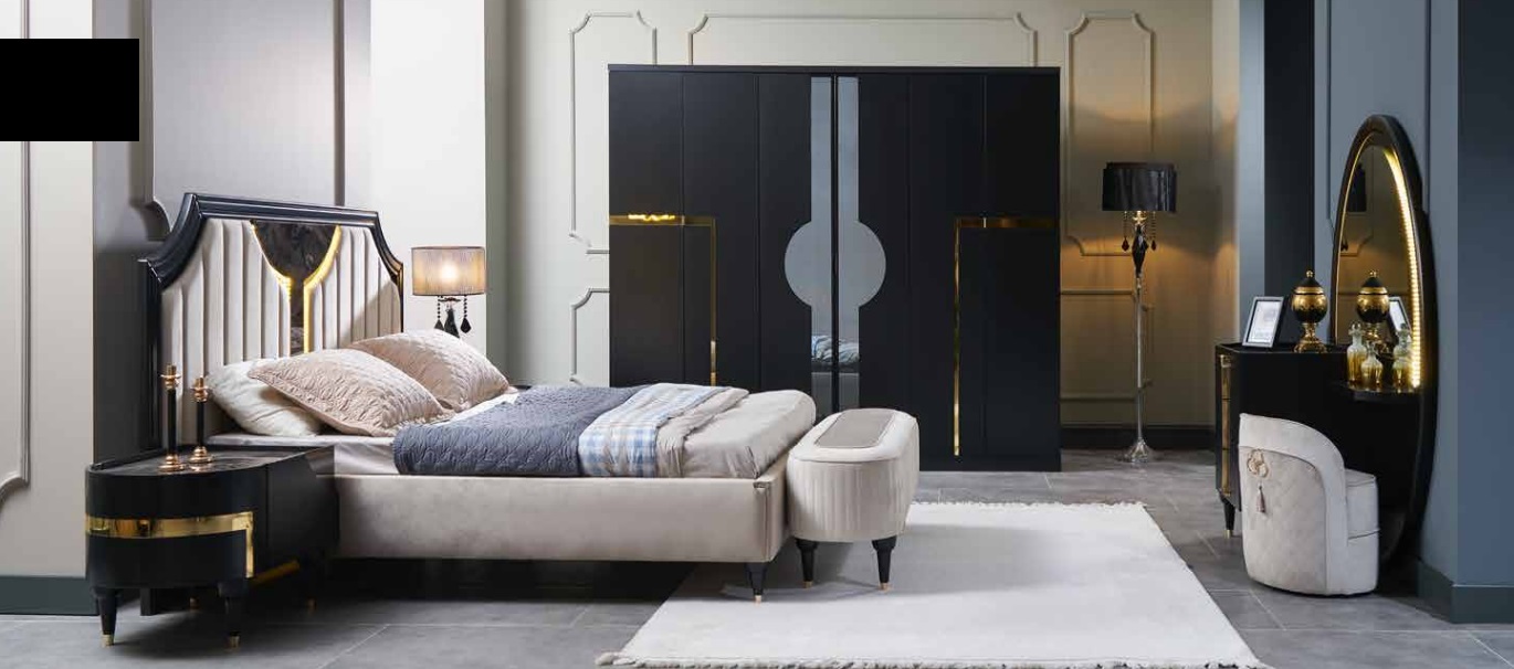 Unser Bettzimmer-Set bietet Ihnen die Möglichkeit, Ihr Schlafzimmer nach Ihren individuellen Bedürfnissen zu gestalten. Das Set beinhaltet ein Bett mit den Maßen ca. 175 x 207 x 135 cm und einem Schlafbereich von ca. 160 x 200 cm, zwei Nachttische (ca. 75 x 55 x 52 cm), sowie einen Hocker (ca. Ф 50 x 67,4 cm) und einen weiteren Hocker (ca. 160 x 40 x 50 cm). Ergänzt wird das Set durch einen Kleiderschrank (ca. 265 x 65 x 220 cm) und eine Kommode mit Spiegel (ca. 151.3 x 53 x 87.4/169 cm). Das Material ist hochwertiges Holz und das Innengestell besteht aus echtem Holz. Die Farbe entspricht der Abbildung. Kontaktieren Sie uns direkt für jede gewünschte Anpassung!